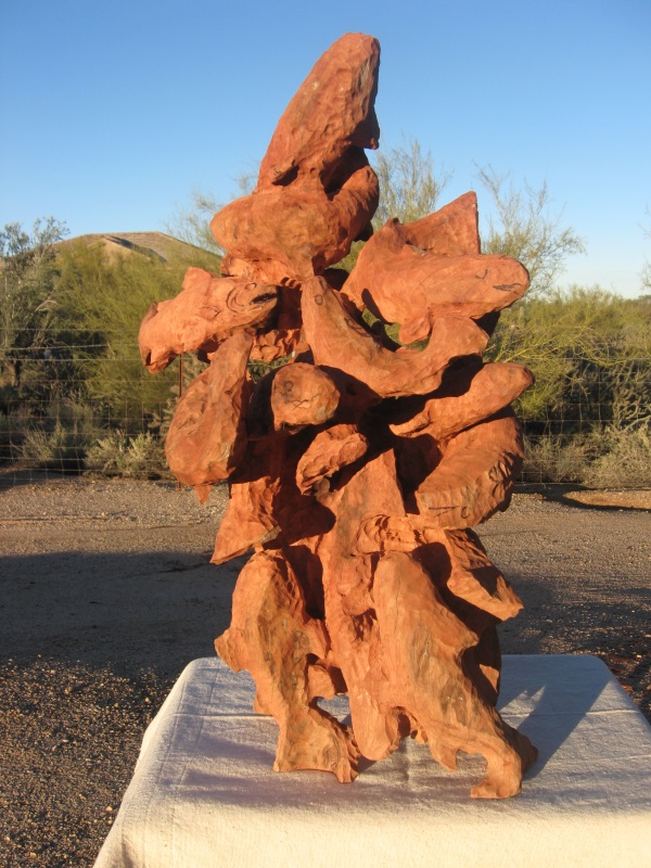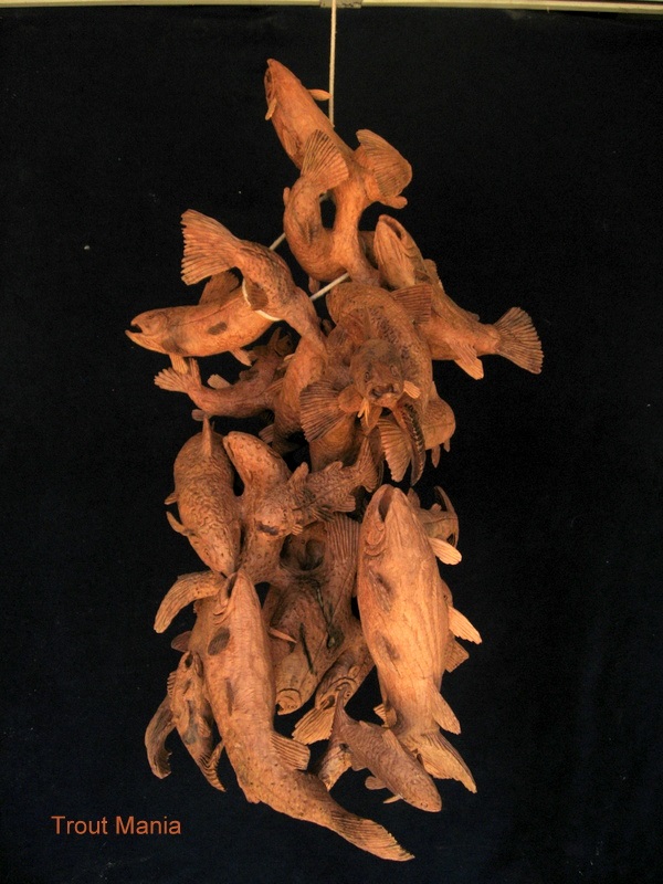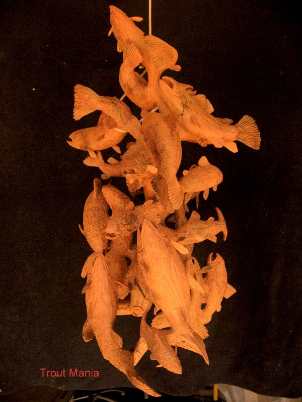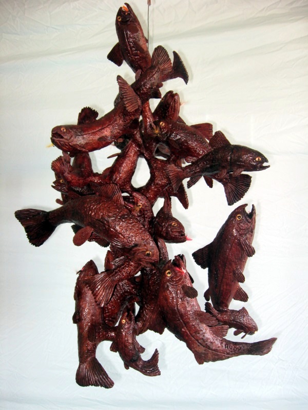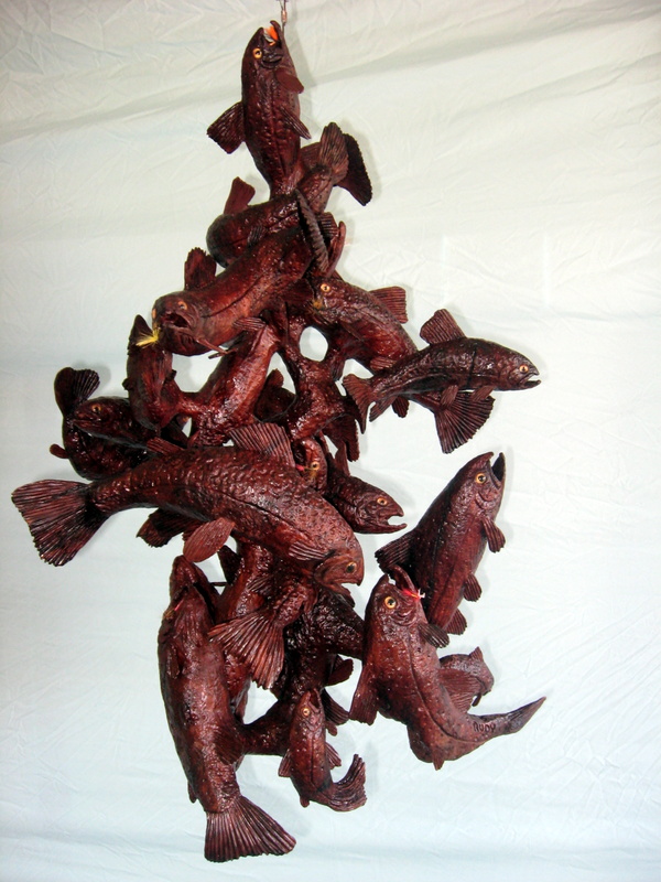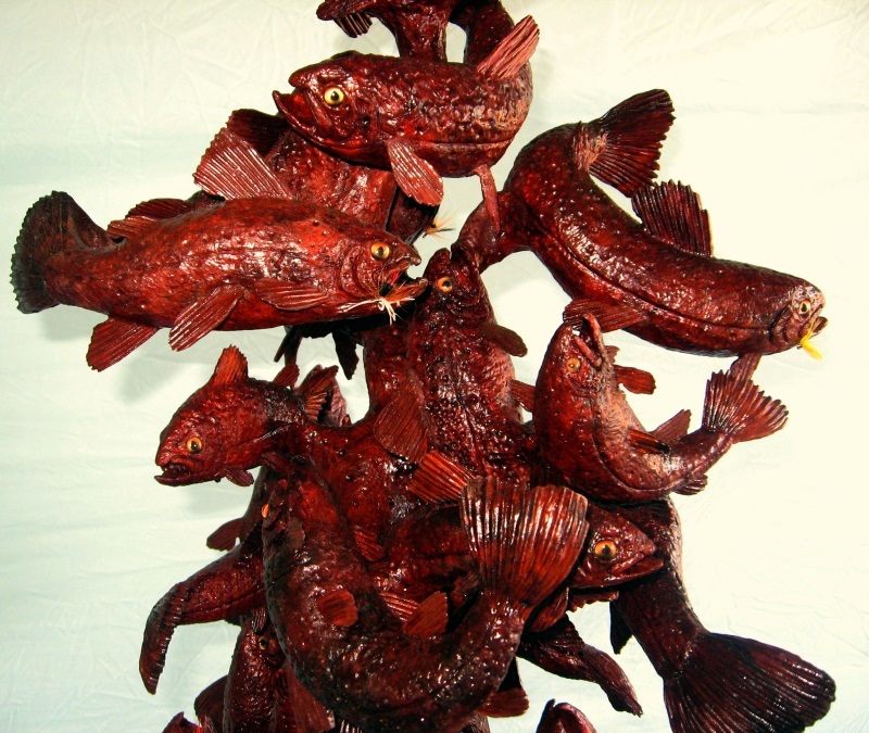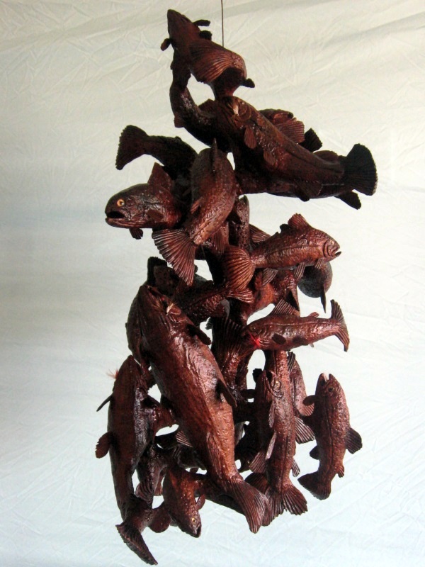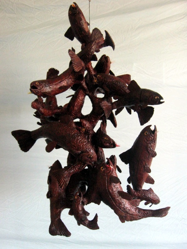 This is carved from ancient redwood from the California coast. It was seasoned for one year, took 6 months to carve and is inspired by the beauty and splendor of the rainbow trout.